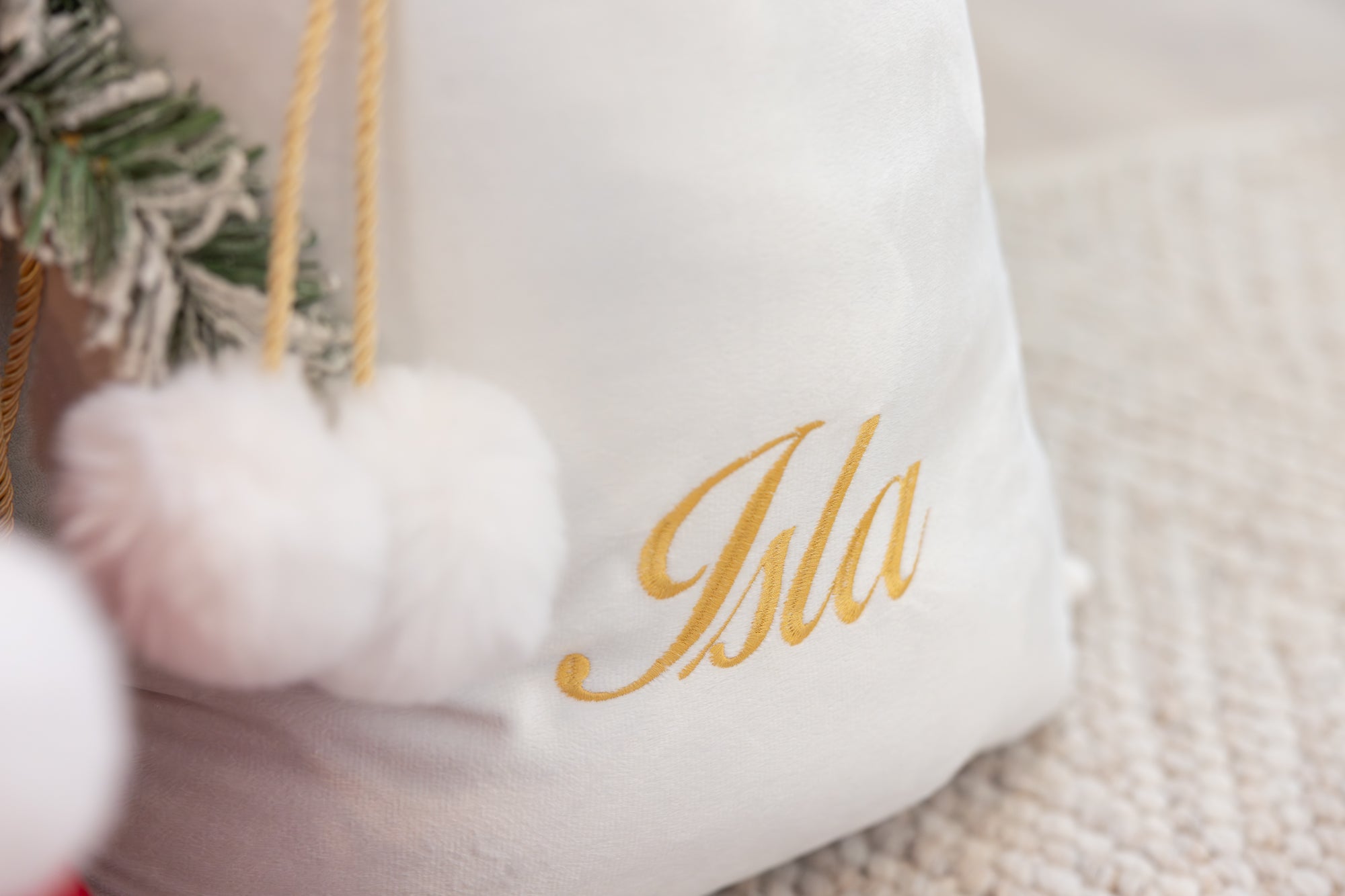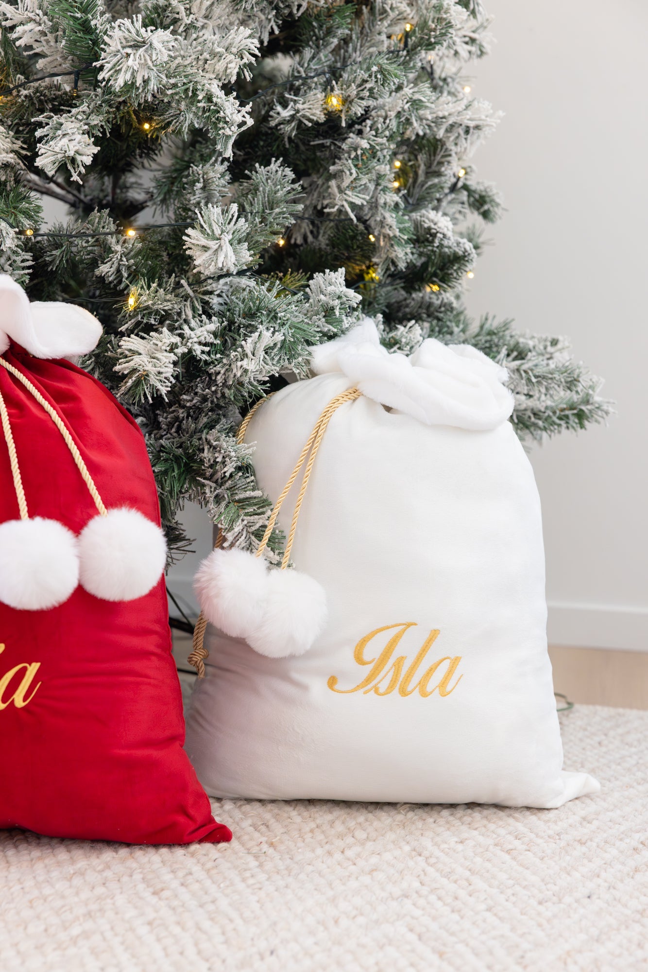 Crafted as a timeless keepsake, our generous 70cm tall x 50cm wide sacks feature a stunning white faux fur trim, golden rope, and delightful white fluffy pom-poms. Designed to become a treasured heirloom, they will be a cherished part of your family's Christmas traditions for years to come.